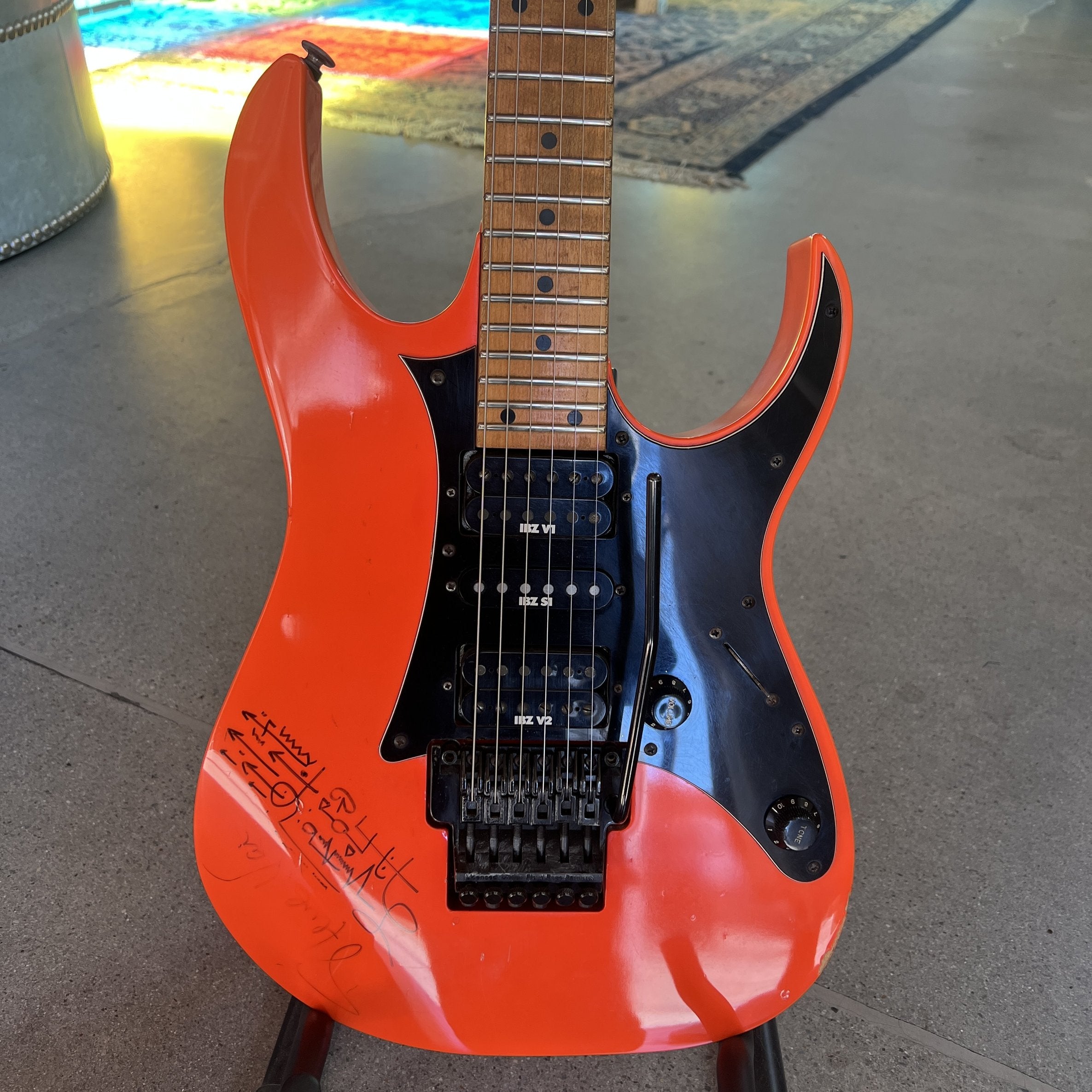This is an extraordinary opportunity to acquire an historically significant instrument: a confirmed Prototype Ibanez RG550 from the first year of production (1987), personally owned and signed by guitar virtuoso Steve Vai.