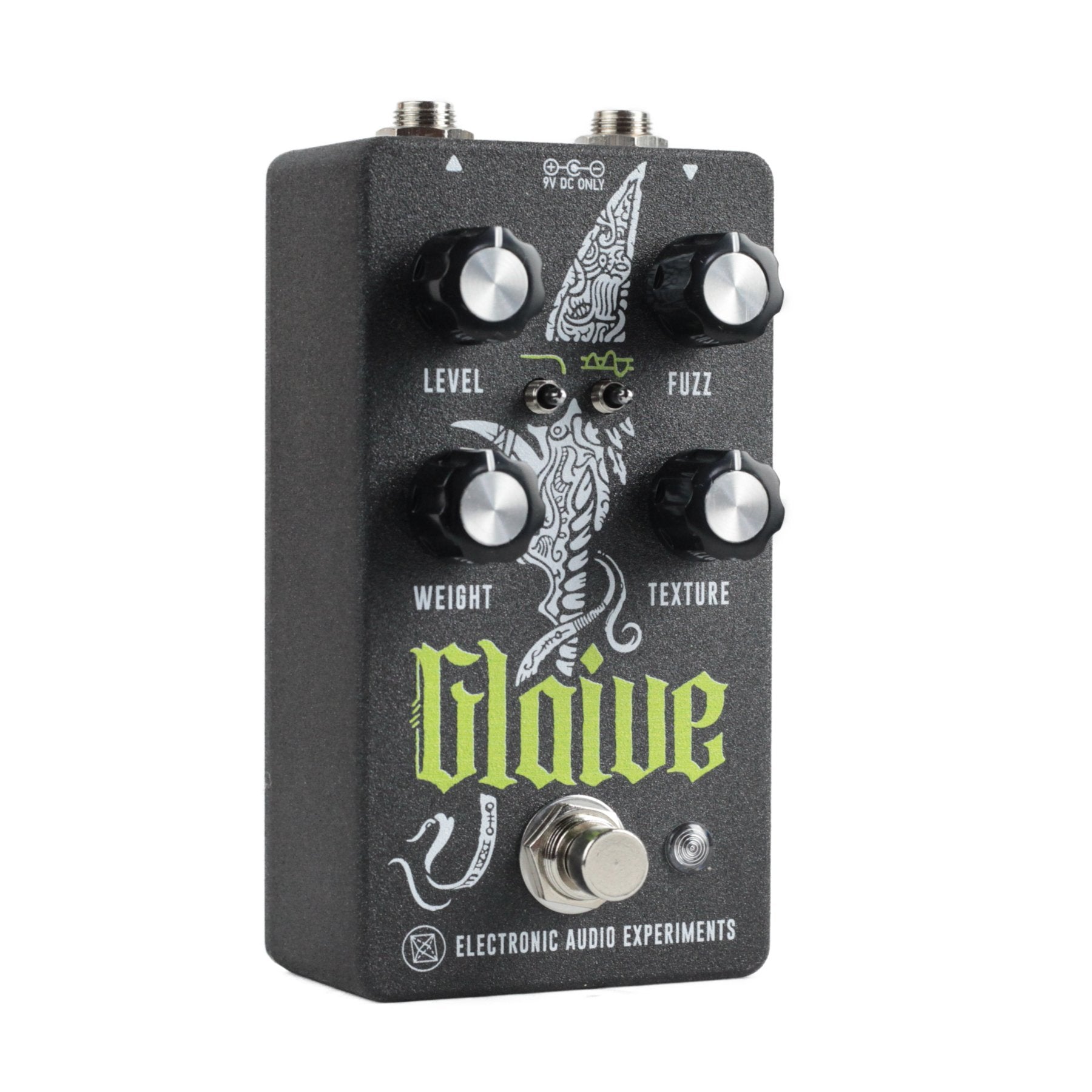 The Electronic Audio Experiments Glaive is the most dangerous gain device in our lineup. This discordant yet deceptively versatile op amp fuzz is capable of over +80dB of gain. The Weight knob adjusts a lightly resonant high pass filter at the input, for tones ranging from tight, ripped- speaker grind to bass-rich sludge. Texture blends in a full-wave rectified analog signal, producing an octave up that gets fed into the fuzz input. Use it for subtle scrambling, or to generate piercing intermodulation products and sub-bass artifacts with a synthesizer-like attack. The LPF toggle can focus harsh overtones or unleash a full-spectrum cut through any mix. Finally, the Squelch toggle enables a brute-force, highly effective bias gate that can temper even the most fanatical gain levels and impart a crumbly, ripping quality to the note decay.