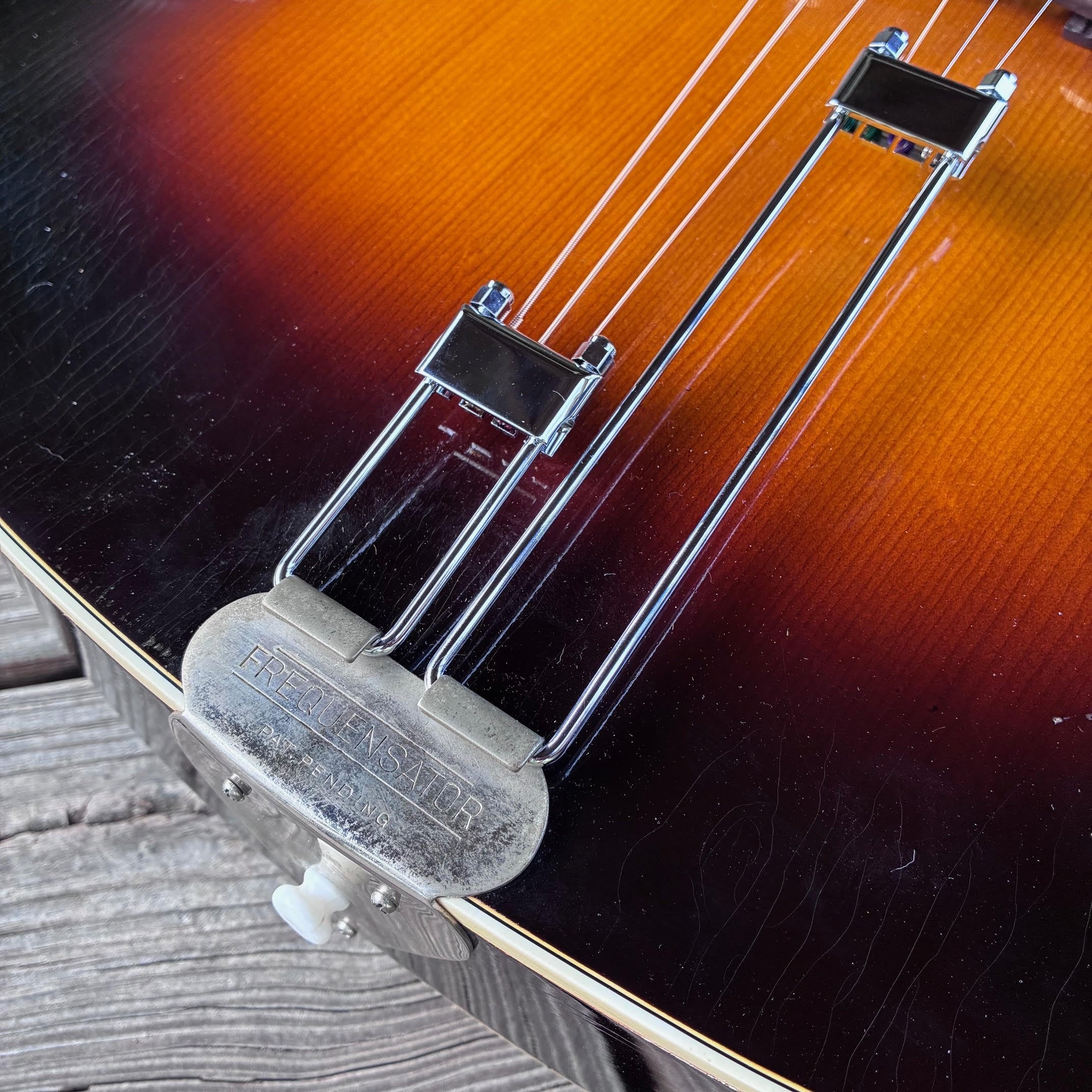 Here is a 1951 Epiphone Triumph archtop that is in really good condition and plays really nicely. Neck is straight and guitar plays great all the way up the fretboard. Low action with a really nice tone. This 75 year old guitar looks like it was hardly ever played. Frets are in incredible condition and the entire guitar is in really good condition. The original pickguard disintegrated which caused the only finish marks you see on the guitar. It really is a clean old Triumph that looks like it’s had hardly any use. It’s time for that to change. This guitar really is a great archtop from a time when Epiphone made some of the best archtop guitars. The mounts for the pickguard is still attached. The original bridge was lost over time and replaced. As was the part of the frequesator tailpiece that the strings attach to. The original patent pending part that attaches to the body is still included. Could easily be put back to 100% original but it’s really nice as is. No case, but will be packed super well for safe arrival. If you’ve been looking for an old Triumph, this really is a nice one. Beautiful sunburst and the back is more of a dark cherry finish. Very similar to my old Gibson L-10 in that regards. Original finish. Original tuners. No cracks or issues with the body or neck.