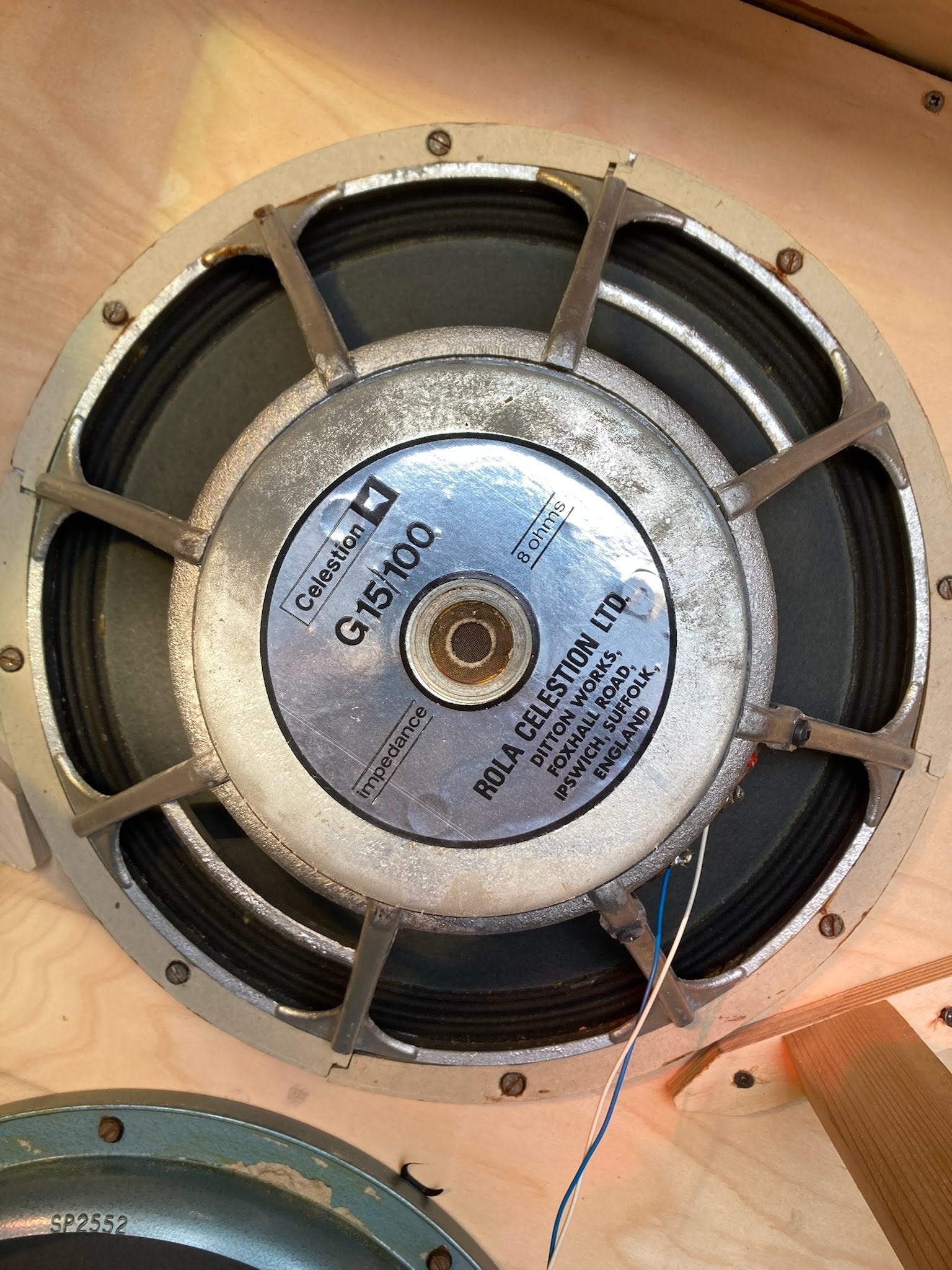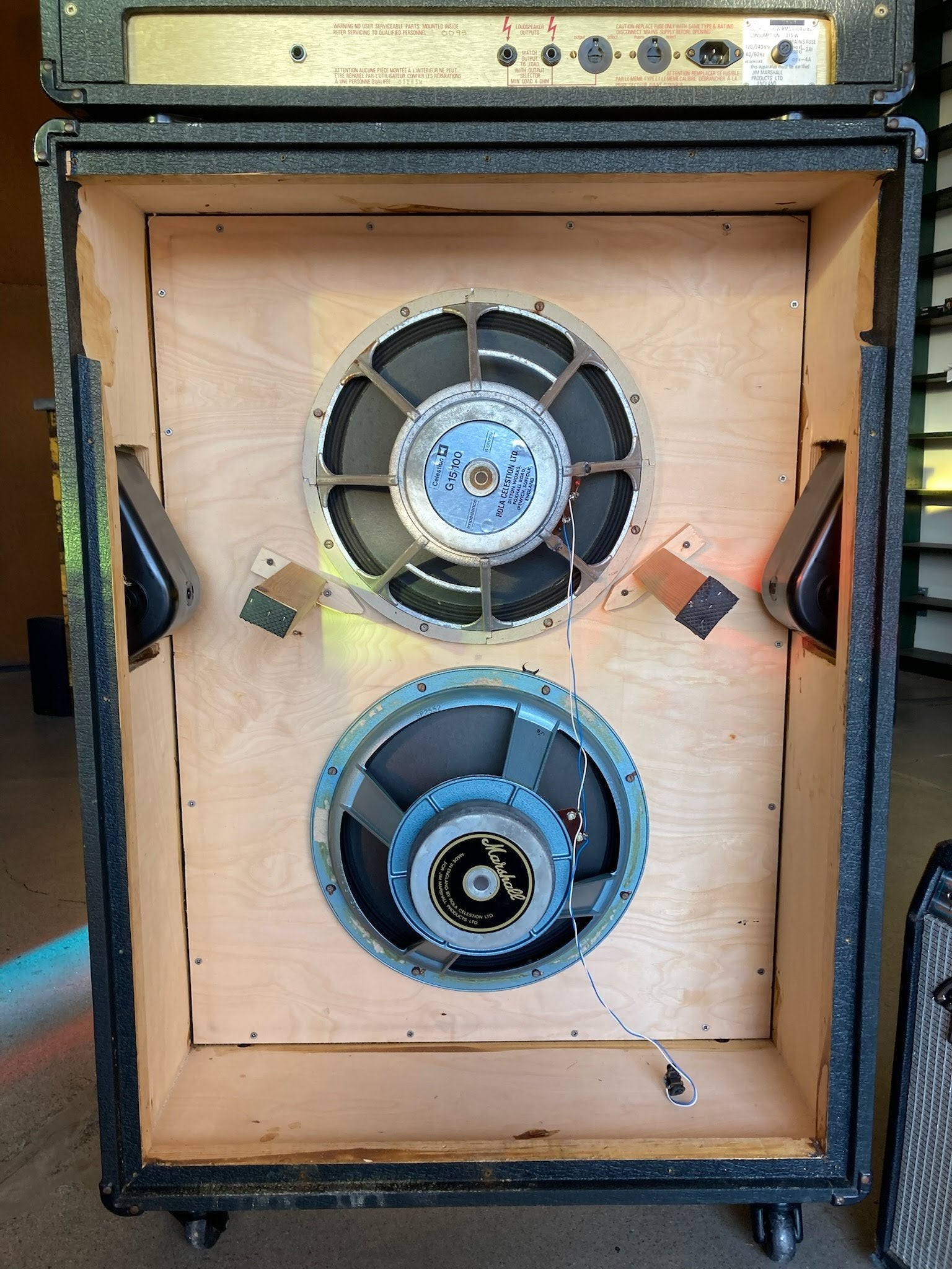 This cabinet has been reloaded and does not contain the original Celestion Sidewinders. This makes the cab highly usable but is reflected in the price. The current speakers are: