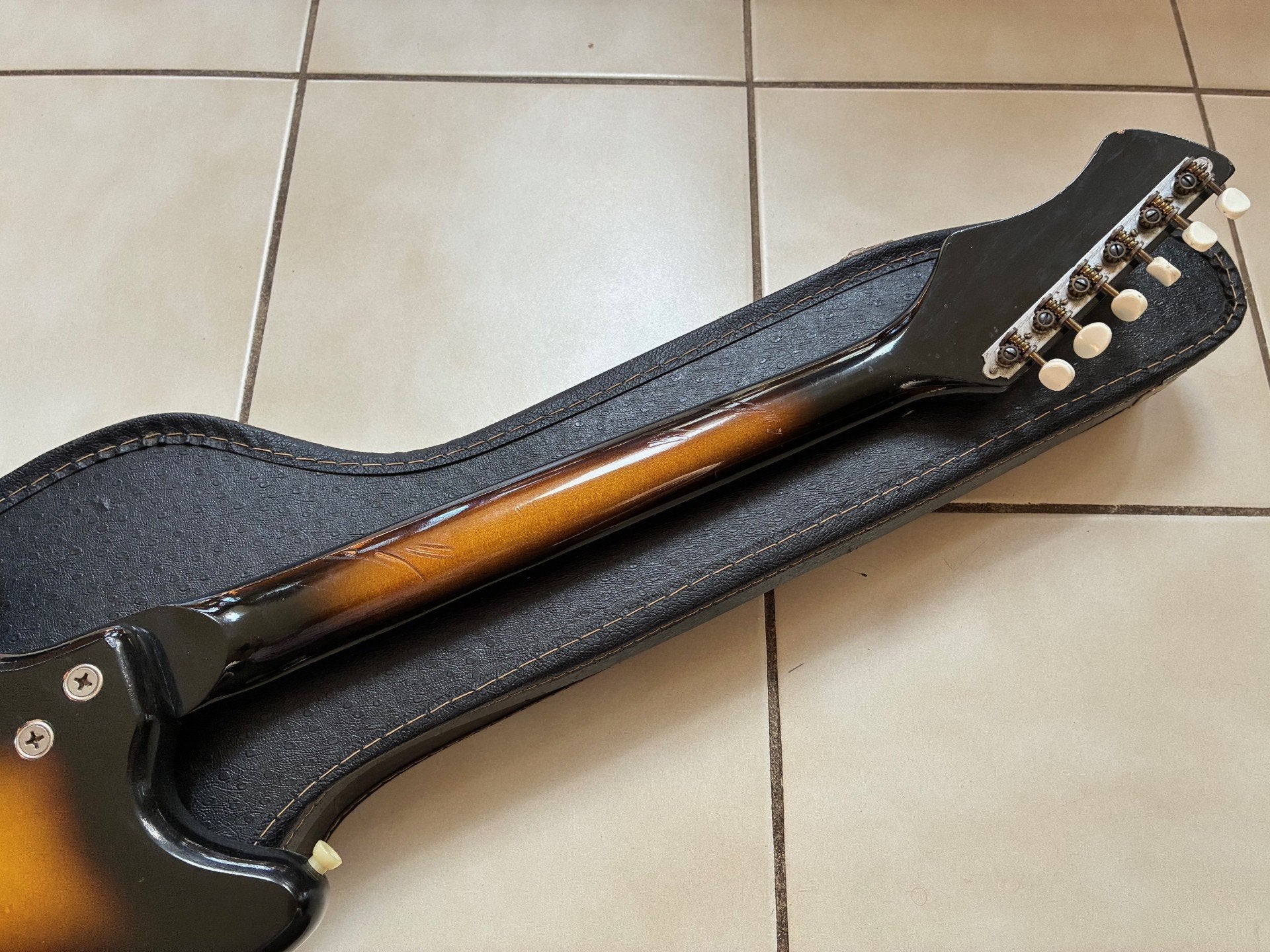 Here is an all original, little-used 1960's Harmony Bobkat. Excellent condition. Plays nice and sounds great. Straight neck and good frets. Some finish wear on the back of the neck from what was probably an old cord in the case. Overall very clean and nice version of one of these. Very playable and tremolo functions nicely.