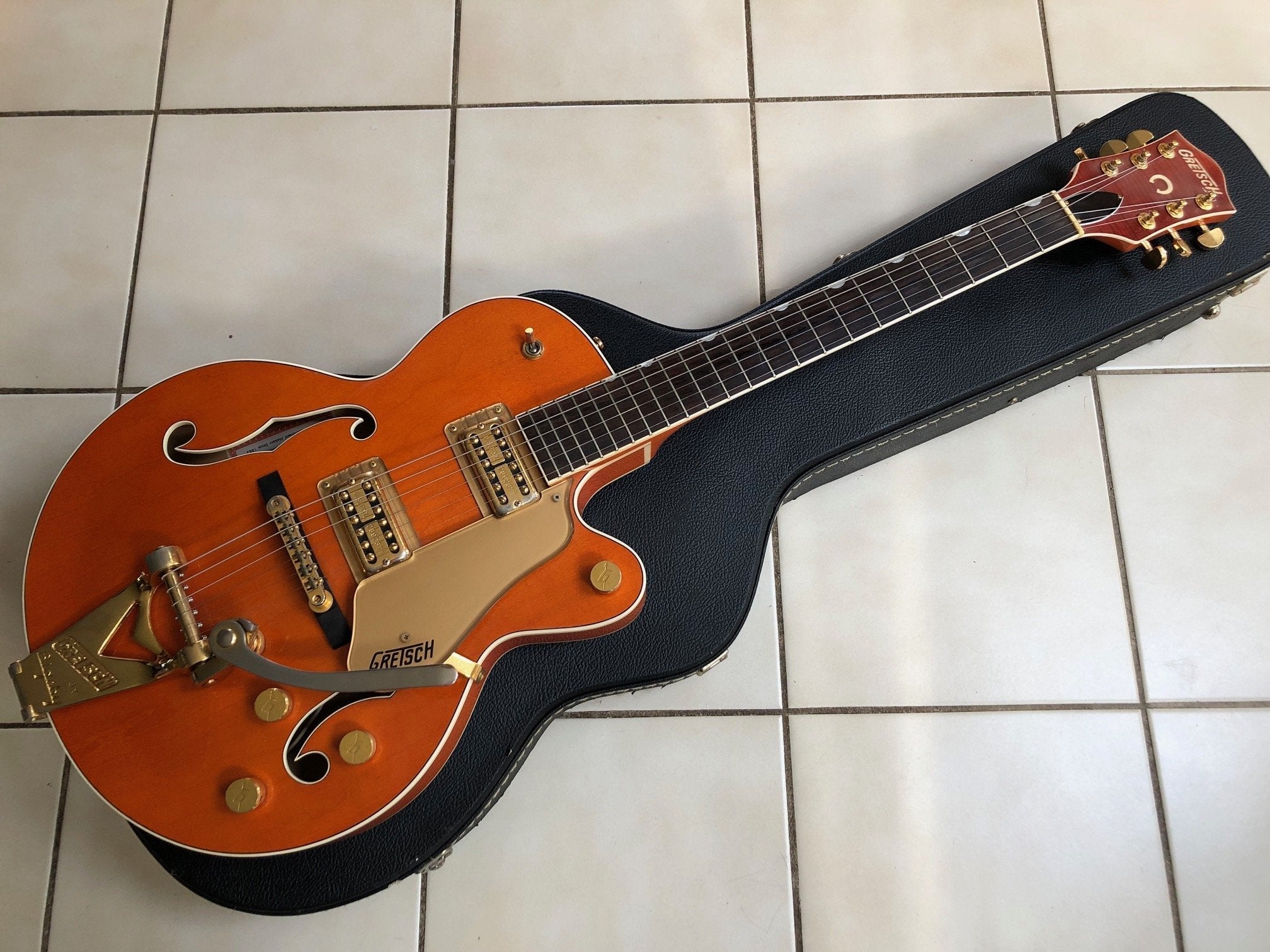 Here is an all original 2003 Gretsch 6120jr. The guitar is in excellent condition overall and comes with the original case. Guitar plays and sounds amazing. Super low action with a straight neck. The pickups really sound good on this one. I love these smaller bodied 6120jr's. Great guitar that is sure to make it's new owner very happy.